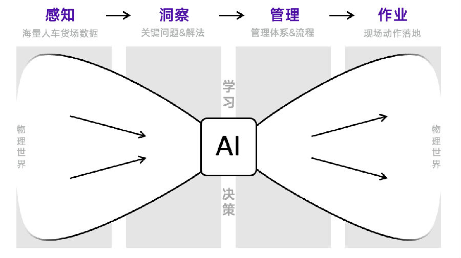 物流蝴蝶结模型是G7易流物流AI产品的底层逻辑,核心是通过AI衔接“物理数据采集——管理决策——一线作业”,形成完整闭环: